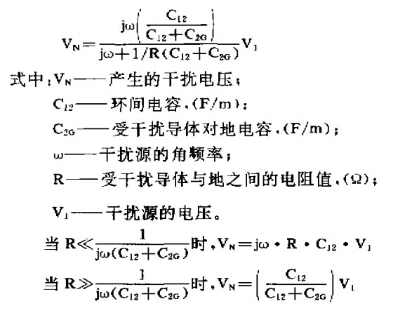 此種干擾是由于導(dǎo)線之間的電容及環(huán)與環(huán)之間的分布電容引起的,產(chǎn)生的靜電感應(yīng)電壓與干擾源的頻率和上述兩種電容的大小有關(guān)。
